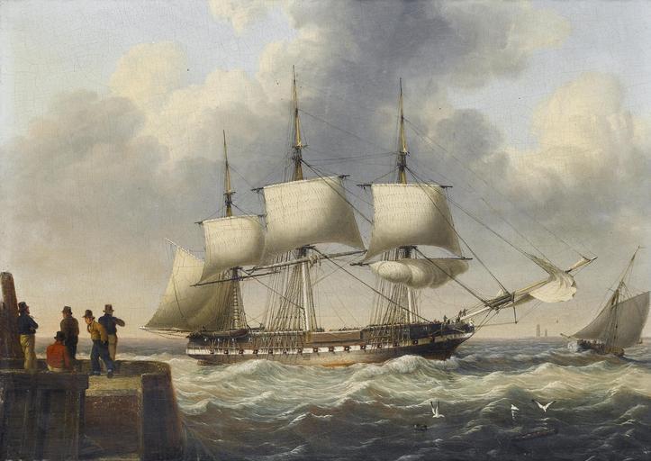 View Original:John_Ward_of_Hull_-_A_frigate_shortening_sail_as_she_runs_into_port.jpg (3169x2243)