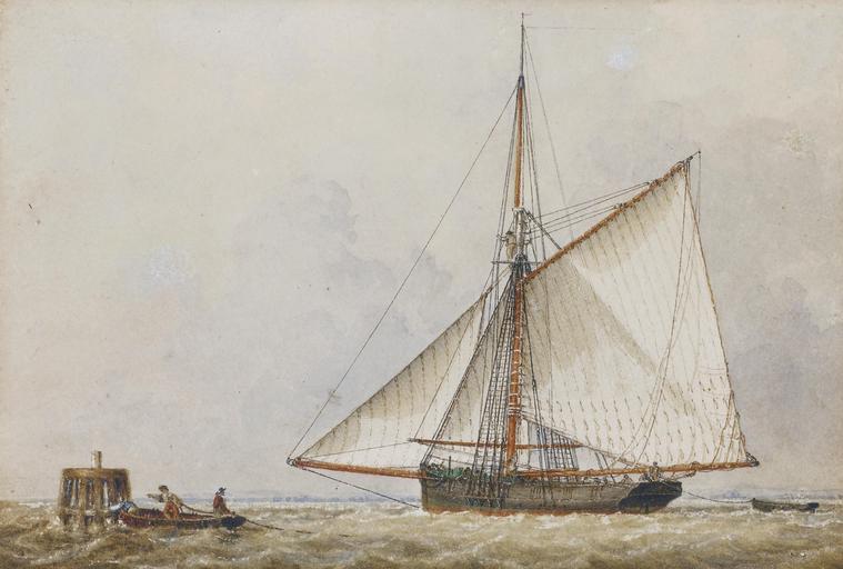 Keywords: John Ward of Hull - A trading cutter shortening sail as members of her crew carry a mooring rope to a wooden dolphin nearby.jpg John Ward of Hull 1798-1849 other date pen indian ink and watercolour heightened with white cm 13 19 4 object history credit line accession number http //www bonhams com/auctions/18783/lot/97/ Bonhams PD-Art-100 John Ward 19th-century sailing ships in paintings Paintings of seascapes Images from Bonhams |
