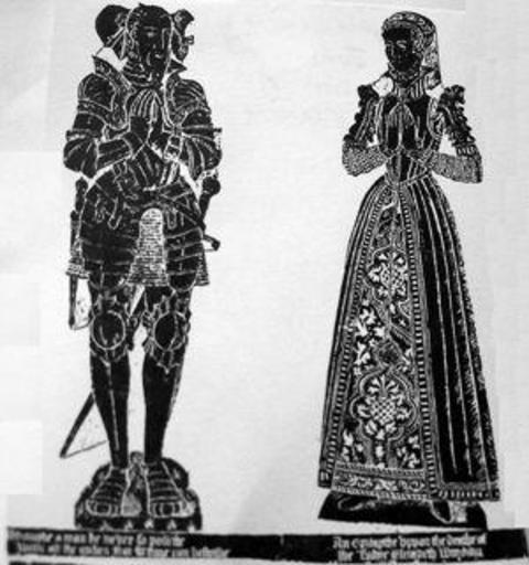 | Keywords: JohnWyndham&ElizabethSydenhamWatchet.jpg en photograph of 19th c brass rubbing of monumental brass of Sir John Wyndham his wife Elizabeth Sydenham d 1571 St Decuman's Church Watchet Somerset http //www flickr com/photos/52219527 N00/5312253292/ unknown sculptor; photo by jmc4 - Church Explorer monumental brass c 1571 Church of Saint Decuman in Watchet interior PD-Art | ||||