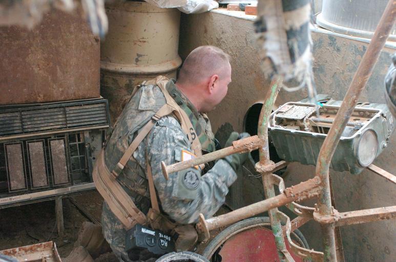 | Keywords: Joint Mission Discovers Bomb Making Materials DVIDS15709.jpg en Sgt 1st Class Rollin Lansford of Alpha Troop 2nd Squadron 9th US Cavalry attached to the 3rd Brigade Combat Team 101st Airborne Division searches the hiding spot of a suspected bomb manufacturer In the foreground is an old military optic device that has already been found in the hole 2006-02-11 Sgt 1st Class Walter Van Ochten https //www dvidshub net/image/15709 15709 2006-02-26 11 33 AD DAWR IQ PD-USGov 101st Airborne Division Images from DoD uploaded by Fæ |