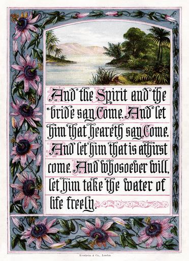 | Keywords: Joseph Martin Kronheim - The Sunday at Home 1880 - Revelation 22-17.jpg Johannes' Åbenbaring 22 17 fra The Sunday at Home A Family Magazine for Sabbath Reading udgivet af Religious Tract Society Kronheim's Baxter process illustration of Revelation 22 17 King James' Version from page 366 of the 1880 omnibus printing of The Sunday at Home Scanned at 800 dpi The greyish border around the flowers is a metallic silver ink however shininess cannot be reproduced in an electronic medium Illustration du verset Ap 22 17 de l'apocalypse version autorisée par le roi Jacques page 366 de l'édition omnibus du Sunday at home Version numérisée à 800 dpi La bordure apparement grisée de l'image est argenté sur l'original une couleur qui ne peut être fidèlement numérisée The Sunday at Home A Family Magazine for Sabbath Reading 1880 collected volume London Religious Tract Society Paternoster Row 164 Picadilly 1880 Joseph Martin Kronheim 1810-1896 PD-Old File Joseph Martin Kronheim - The Sunday at Home 1880 - Revelation 22-17 original scan jpg Original Scan JPEG File Joseph Martin Kronheim - The Sunday at Home 1880 - Revelation 22-17 original scan png Original Scan Archival PNG File Joseph Martin Kronheim - The Sunday at Home 1880 - Revelation 22-17 jpg Cleaned-up version JPEG File Joseph Martin Kronheim - The Sunday at Home 1880 - Revelation 22-17 png Cleaned-up version Archival PNG Assessments c 2010 1 1 File Joseph Martin Kronheim - The Sunday at Home 1880 - Revelation 22-17 jpg Cleaned up dirt stains small hairs and other flaws due to age fixed a few very minor misprints in this particular print e g small ink blobs and slightly incomplete letters Some selective sharpening Baxter process illustration 12 12 15 June 2010 UTC Joseph Martin Kronheim - The Sunday at Home 1880 - Revelation 22-17 jpg Joseph Martin Kronheim Book of Revelation Unidentified Passiflora |