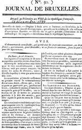 | Keywords: Journal de Bruxelles nr 90 1799 (713).jpg en Nr 90 of the Journal de Bruxelles during the French revolutionary republic occupation of Brussels in 1799 The French republican date is Décadi 30 Frimaire VIII Saturday 21 December 1799 This journal contains many dispatches with news all over Europe Page 713 1799-12-21 Journal de Bruxelles 1799 J L Deboubers File Journal de Bruxelles nr 90 1799 714 715 jpg custom PD-old-100-1923 Uploaded with UploadWizard Journal de Bruxelles nr 90 | ||||