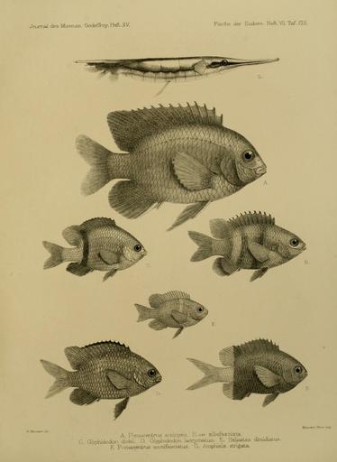 Keywords: JournalMuseumGodoeffroyHeftXVFischederSudseeHeft7Taf125.jpg en As file A Pomacentrus scolopsis Stegastes nigricans B Pomacentrus scolopsis var albofasciata C Glyphidodon dickii Plectroglyphidodon dickii D Glyphidodon lacrymatus Plectroglyphidodon lacrymatus E Heliastes dimidiatus Chromis dimidiata F Pomacentrus semifasciatus Parma microlepis G Amphisile strigata Aeoliscus strigatus http //www biodiversitylibrary org/ of plate unknown Journal Museum Godeffroy Fisches der Sudsee 1886 PD-old Fische der Südsee Journal Museum Godeffroy Pomacentridae Stegastes nigricans Plectroglyphidodon dickii Plectroglyphidodon lacrymatus Chromis dimidiata Parma microlepis Aeoliscus strigatus |