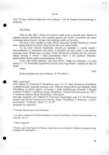 Keywords: Józef Piłsudski - List do Wacława Sieroszewskiego - 701-001-100-109.jpg Piłsudski Institute document pl List do Wacława Sieroszewskiego 1915-07-26 pl Prośba o nagłośnienie problemów z jakimi borykała się I Brygada pl Józef Piłsudski - listy; I Brygada pl Letter Kasprzycki Tadeusz Lublin <br/> Kraków 701/1/100/109 701 180/3274 3569 1 PD-old-auto-unpublished 1935 yes Collections of Józef Piłsudski Institute of America from 1915 Józef Piłsudski in 1915 Letters by Józef Piłsudski |