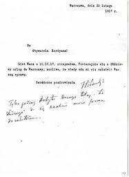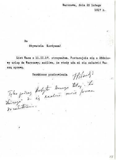 Keywords: Józef Piłsudski - List J. Piłsudskiego do Obywatela Kordyana - 701-001-024-013.jpg Piłsudski Institute document pl List J Piłsudskiego do Obywatela Kordyana 1917-02-20 pl List skierowany przez Józefa Piłsudskiego do Obywatela Kordyana w kwestii jego 28-dniowego urlopu pl Obywatel Kordyan; urlop pl Letter Piłsudski Józef Warszawa 1917-02-11 <br/> 1917-01-20 701/1/24/13 701 180/1663 1715 1 PD-old-auto-unpublished 1935 yes Collections of Józef Piłsudski Institute of America from 1917 Józef Piłsudski in 1917 Letters by Józef Piłsudski |