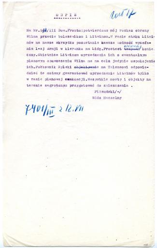 Keywords: Józef Piłsudski - Rozkaz Wodza Naczelnego w sprawie obrony Wilna - 701-001-074-129.jpg Piłsudski Institute document pl Rozkaz Wodza Naczelnego w sprawie obrony Wilna 1925 pl Odpis z dokumentu z roku 1920 wykonany w 1925r z powodu zarzutów do Biura Historycznego pl Obrona Wilna pl Wojna polsko-bolszewicka; Wilno pl Telegram Talens <br/> Rylski Lida <br/> Wilno 7499 701/1/74/129 701 180/3124 3133 Archiwum Józefa Piłsudskiego 1 PD-old-auto-unpublished 1935 yes Collections of Józef Piłsudski Institute of America from 1925 Józef Piłsudski in 1925 Writings of Józef Piłsudski Military documents of Second Polish Republic |