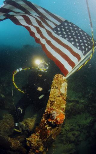 Keywords: JPAC divers plant flag.jpg MICRONESIA Feb 14 2008 Petty Officer 1st Class Julius Mcmanus assigned to Mobile Diving Salvage Unit MDSU 1 plants an American flag on the site where an American WWII military aircraft crashed into the Pacific Ocean Deep sea divers are assigned to Joint POW/MIA Accounting Command JPAC accounting of all Americans missing as a result of the nation's past conflicts http //www news navy mil/view_single asp id 56228 Navy NewsStand Photo ID 080214-N-8298P-017<br />http //www news navy mil/ Navy NewsStand Home 2008-02-14 United States Navy Mass Communication Specialist 2nd Class Christopher Perez PD-USGov-Military-Navy People of the United States Navy Military people with a flag of the United States Surface supplied diving Joint POW/MIA Accounting Command Underwater photographs of surface supplied divers Photographs of flags of the United States Underwater photographs of flags Aircraft crash sites |