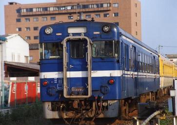 | Keywords: JR West Kiha 23 507 Higashi Hagi.jpg en JR West Kiha 23 507 with Tsuyama livery just after its movement from Tsuyama to Ogori approaching HIgashi Hagi station ja 萩駅に 入するJR西日 キハ23 507を 後尾とする列車 キハ23 507は津山から転属してきた直後で 津山色と広島色が混結された姿 1993-10-10 own Hahifuheho other versions cc-zero JNR Kiha 23 JR West 1993 in rail transport in Japan October 1993 in Japan |