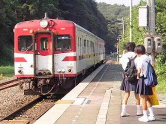 Keywords: JRE-DC52-Akaoni.jpg East Japan Railway Company DMU Type 52 Akaoni at Kami-yonai Sta Yamada Line キハ52形気動車赤鬼色 山田線上米内駅にて Own 2000-07-24 Cassiopeia_sweet JNR Kiha 52 JR East Kamiyonai Station