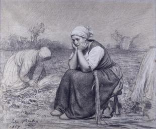 | Keywords: Jules Adolphe Aimé Louis Breton - Repose - Walters 37902.jpg  This drawing dates from perhaps the most formally successful decade of Breton's career The artist represents a young woman lost in dreamy contemplation as she pauses for rest during the harvest Her fellow harvesters continue to work behind her and there are haystacks visible in the distance The contrast is notable between the highly finished manner of the resting woman and the far sketchier treatment of the landscape background and secondary figures The resting woman is characteristic of Breton's classicizing treatment of form in the 1860s but it may also reflect an awareness of more recent sources 1867 charcoal and white chalk on blue thick heavily textured cartridge-style laid paper; the blue color comes from blue and red textile fibers in a white furnish cm 47 6 57 5 accession number 37 902 20842 William T Walters Baltimore before 1879 mode of acquisition unknown Henry Walters city Baltimore Walters Art Museum Henry Walters Acquired by William T Walters before 1879 Jules Breton/1867 in charcoal lower right; 823 on reverse of frame upper right; Walters 209 on label attached to reverse of frame upper left; watermarked MFDT in block letters The Essence of Line Jules Breton and the French Rural Tradition The Dixon Gallery and Gardens Memphis; The Sterling and Francine Clark Art Institute Williamstown; Joslyn Art Museum Omaha 1982-1983 place of origin France Walters Art Museum license 2D The Essence of Line Paintings by Jules Breton Temporary for Cat-a-lot - Female humans Black and white photographs of hand gestures Hands on head People resting Sitting with hand on head Kerchiefs in art Drawings in the Walters Art Museum 1867 drawings Contemplation |