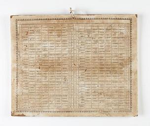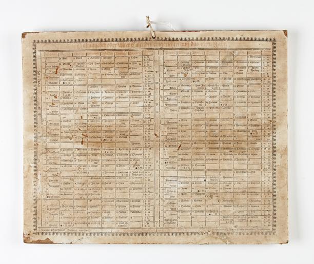 Keywords: Juliansk kyrkokalender för år 1671, skriven på tyska - Skoklosters slott - 93147.tif LSH artwork Michael Weber boktryckare sv Benämningar på kyrkliga helgdagar tryckt i rött övriga helgonnamn tryckt i svart Frakturstil <br/>Sign Gedruckt zu Stralsund durch Michael Weber Kalendern är uppställd i två spalter vilka vardera omfattar de sex första resp de sex sista av årets månader Varje spalt indelad i sju kolumner en för varje veckodag-alla månaders söndagar är t ex är alltså placerade lodrätt undeer varandra Längst till vänster smal kolumn där antalet dagar i varje månad anges 31 28 31 30 30 31 31 31 30 31 <br/>Längst t h en kolumn där tiderna för solens upp- och nedgång anges per vecka Månens faser anges med måntecken och kombination siffra-bokstav Viertelstunden vid den gällande dagen Runt almanackan en bård med fristående palmetter <br/>Papperet limmat på ekskiva Papperet vikt runt kortsidorna ca 2 cm <br/>Upphängningsögla av linneband dragen genom ett hål original caption Juliansk kyrkokalender för år 1671 skriven på tyska <br/> Nyckelord Kalender Tidräkning Tidmätning Almenacka Föremålsbild 1600-tal 1670 size mm 423 338 9 SKO place of origin original filename sm_dig5608 31760 inventory number SKO 10678 93147 CC-BY-SA Fredrik Andersson Almanacs Time Fredrik Andersson Media contributed by LSH unmatched creator Media contributed by LSH unmatched keyword Media contributed by LSH 2014-11 |