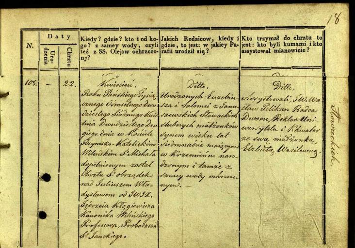 | Keywords: Juliusz Słowacki birth certificate.jpg en Juliusz Słowacki birth certificate pl Akt chrztu Juliusza Słowackiego W Wilnie jedynie dopełniono obrządek chrztu Juliusza urodzonego w Krzemieńcu z Euzebiusza i Salomei z Januszewskich Na stronie internetowej litewskiego archiwum odnalazła pani Monika Janczewska parafia św Jana w Wilnie akt chrztu nr 105/1827 http //www epaveldas lt/vbspi//content/biImage jsp biRecordId 3908 imageId 2Fvbspi 2FshowImage do 3Fid 3DPG_S_30554_37 parafia św Jana w Wilnie 1827 PD-old Juliusz Słowacki Birth certificates of Poland |