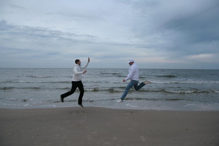 Keywords: jump baltic sea beach seaside sea sand beach friends lust cloudy sky