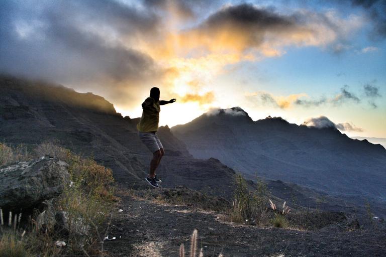 Keywords: jump sunset people happy silhouette mountains character see freedom