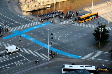 Keywords: junction traffic zebra crossing auto right of way main road turn road road network drive cycle path grey roadway city cycling cyclists pedestrian