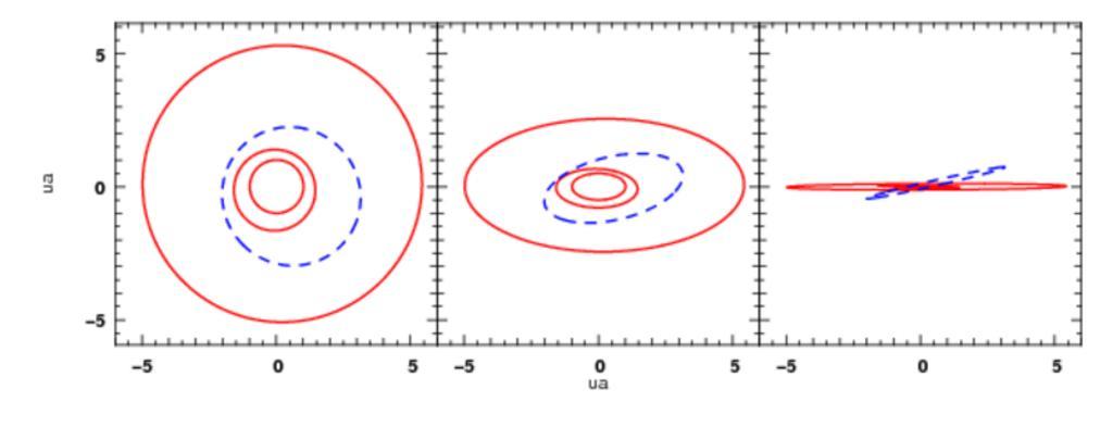| Keywords: Juno orbit.png Orbit of asteroid 3 Juno blue dashed line compared to those of Earth Mars and Jupiter red solid ellipses Viewing angles are 90° Earth's orbit is view face-on 30° and 0° Earth's orbit edge-on Orbite de l'astéroïde 3 Junon ligne pointillée blue comparée à celles de la Terre de Mars et de Jupiter ellipses rouges Les angles de vue du dessus l'orbite de la Terre est vue de face de biais à 30° et de côté l'orbite terreste est vue par la tranche self-made computation from orbital elements plotting and saving as Postscript using Yorick; convertion to PNG with convert 2008-03-13 Omegaiota 3 Juno |