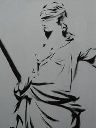 Keywords: justice judgmental justitia justitia horizontal sword tie blindfold woman person abstract drawing image art painting black and white