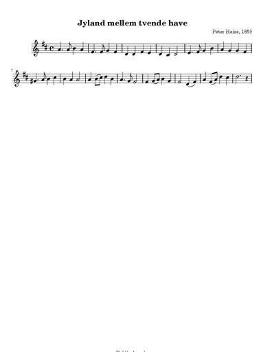 Keywords: Jyland mellem tvende have.png Danish song written by H C Andersen in 1859 with Music by Peter Heise 1859 Lilypond <pre> <nowiki> \include deutsch ly \version 2 6 4-5 \header title Jyland mellem tvende have composer Peter Heise 1859 copyright Public domain melody \clef treble \time 4/4 \key d \major \relative c' a'4 a8 h4 a4 fis4 fis8 g4 fis4 d4 d4 fis4 e4 d4 cis4 d2 e4 fis8 g4 h4 a4 g4 g4 fis4 gis4 a8 h4 cis4 h4 a4 a2 a4 h8 cis8 d4 h4 a4 g8 fis2 fis4 g8 a8 h4 g4 fis2 d4 fis a fis8 a d4 cis d2 r4 \score \new Staff \melody </nowiki> </pre> Also See Jyland mellem tvende have mid Find midi here Violin for beginners thumb 250px left Music Sheet <br style clear both; > PD-old Music of Denmark |