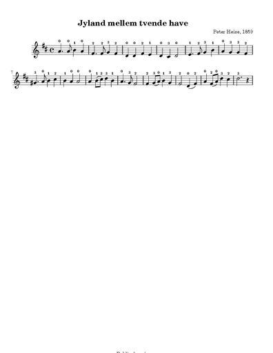 Keywords: Jyland mellem tvende have-violin.png Danish song written by H C Andersen in 1859 with Music by Peter Heise 1859 Lilypond <pre> <nowiki> \include deutsch ly \version 2 6 4-5 \header title Jyland mellem tvende have composer Peter Heise 1859 copyright Public domain melody \clef treble \time 4/4 \key d \major \relative c' a'4 -0 a8-0 h4-1 a4-0 fis4 -2 fis8-2 g4-3 fis4-2 d4-0 d4-0 fis4-2 e4-1 d4-0 cis4-3 d2-0 e4 -1 fis8-2 g4-3 h4-1 a4-0 g4-3 g4-3 fis4-2 gis4 -3 a8-0 h4-1 cis4-2 h4-1 a4-0 a2-0 a4-0 h8-1 cis8-2 d4-3 h4-1 a4 -0 g8-3 fis2-2 fis4-2 g8-3 a8-0 h4-1 g4-3 fis2-2 d4-0 fis-2 a-0 fis8-2 a-0 d4-3 cis-2 d2 -3 r4 \score \new Staff \melody </nowiki> </pre> Also See Jyland mellem tvende have mid Find midi here Normal sheet thumb 250px left Music Sheet <br style clear both; > PD-old Music of Denmark |