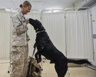 Keywords: K9 patient 140113-N-LE393-005.jpg en U S Marine Corps Cpl Johanna Robbins a military working dog handler with the 13th Marine Expeditionary Unit law enforcement detachment plays with Quick a black lab explosives search dog before a veterinary procedure to clean out his ear canals Quick had earwax dirt and a yeast infection in his ears U S Navy photo by Mass Communication Specialist 1st Class Eric Dietrich/Released 2014-01-13 Petty Officer 1st Class Eric Dietrich https //www dvidshub net/image/1150191 140113-N-LE393-005 2014-01-14 08 00 CAMP LEMONNIER DJ PD-USGov-Military-Navy 13th Marine Expeditionary Unit Camp Lemonnier Images from DoD uploaded by Fæ |