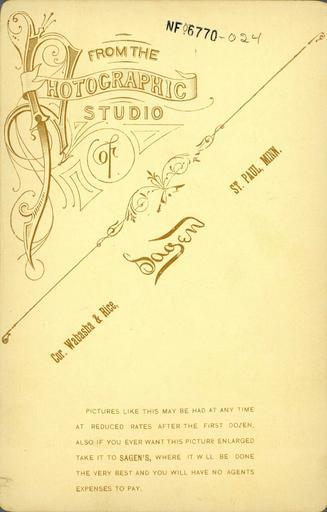 Keywords: Kabinettfotografi, Norskamerikanere, Norsk Folkemuseum NF.06770-024, bilde 2.jpg nb Kabinettfotografi av ukjent kvinne baksiden av kortet Norskamerikaner Fotografiet er kommet inn i forbindelse med Jeg fant jeg fant innsamlingen i 1962 Serien er fra norsk-amerikansk miljø Enkelte av fotografene har norskliknende navn en Cabinet card unknown female back of card Norwegian American 1890 NF NF 06770-024 kabinettfotografi-norsk-amerikanere-kvinne-i Sagen Minnesota St Paul USA / Norsk Folkemuseum <gallery> File Kabinettfotografi Norskamerikanere Norsk Folkemuseum NF 06770-024 bilde 1 jpg </gallery> PD-old Cabinet cards Norwegian Americans |