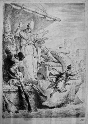| Keywords: Kaiser Heinrich IV springt.jpg Kaiser Heinrich IV springt vom Schiff seines Entführers des Erzbischofs von Köln Radierung von Bernhard Rode 1781 Der bereits im Knabenalter zum Kaiser gekrönte Heinrich der Vierte wird von dem Erzbischof Hanno seiner Mutter Agnes zu Schiffe aus Kaiserswerth am Rhein entführt Die Regentin Mutter steht voll Jammer nebst ihrem Hofgesinde auf der Burg Ihr Sohn springt aus dem Schiffe in den Rhein worüber der Erzbischof voll Schrecken die Hände gen Himmel erhebt Graf Ekbert von Braunschweig streckt höchst mitleidig die Hände aus um ihn noch zu ergreifen “ Die Geschichte setzt hinzu dass dieser Graf sogleich mit Gefahr seines Lebens nachgesprungen sey und ihn gerettet habe Katalog der Berliner Akademie-Ausstellung 1786 in Kataloge der Berliner Akademie-Ausstellungen 1786-1850 bearb von H Börsch-Supan Bd 1 Berlin 1971 Emperor Henry IV Jumps from the Ship of his Kidnapper the Archbishop of Cologne engraving by Bernhard Rode 1781 Henry the Fourth already crowned emperor during his boyhood is kidnapped from his mother Agnes by the archbishop Anno on board a ship at Kaiserswerth on the Rhine His regent mother stands in utmost misery at the castle with her court entourage Her son jumps out of the ship into the Rhine at which the archbishop horrified raises his hands to the heavens Count Ekbert of Braunschweig stretches out his hands most pityingly to catch him - History also relates that risking his own life this count immediately jumped after him and saved him Catalog of the 1786 exhibition of the Berlin Academy reprinted in Kataloge der Berliner Akademie-Ausstellung 1786-1850 ed by H Börsch-Supan vol 1 Berlin 1971 own own photography engraving Creator Bernhard Rode photo James Steakley engraving 1781; photo 2009 01 17 PD-old-100 Henry IV Holy Roman Emperor Agnes of Poitou Anno II 1780s etchings by Bernhard Rode 1781 etchings Horror emotion |