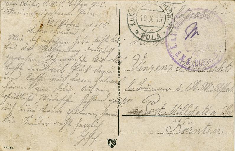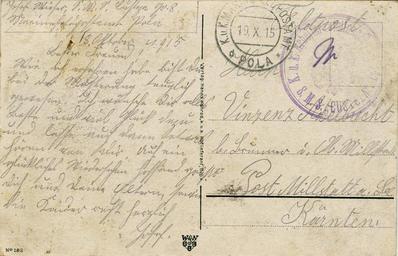 Keywords: Kaiser Wilhelm II Truppenbesuch Ostpreußen Lyck 1915 reverse.jpg Feldpost aus dem Ersten Weltkrieg Rückseite einer Ansichtskarte vom deutschen Kaiser Wilhelm II in Lyck Die Karte wurde am 19 10 1915 als Feldpost von Pula damals Teil des österreichisch-Ungarischen Küstenlandes heute Kroatien nach Obermillstatt in Kärnten verschickt Aufdruck žAndenken an den Weltkrieg 1914/15 Kaiser Wilhelm II in Lyck Die Karte stammt von einem Rekruten der auf der SMS Custoza ein Seekadettenschulschiff Hilfsschiff als Zimmermann arbeitete Military propaganda postcard of the German Empire This postcard lithograph was sent on 19 10 1914 as field post from Pula at that time part of the Austro-Hungarian Littoral nowadays Croatia to Obermillstatt in Carinthia The card is from a recruit who worked on the SMS Custoza a training ship for cadets auxiliary boat as a carpenter thumb 120 px Front side scan and uploaded by Joadl 1915 Verlag Hanns Konrad k u k Hoflieferant Brüx Nr 183 User Joadl/Ref2 PD-old Files by User Joadl Joadl_AUST Joadl_WW1 1915 postcards of Germany Feldpost World War I Backs of postcards Sütterlin