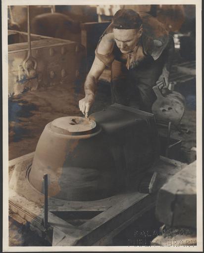 Keywords: kalamazoo public library michigan history photography stove company factory manufacturing combustion chamber sand iron worker photo border Interior of Kalamazoo Stove Company. Moulding a combustion chamber in sand. Unidentified man working. The original photo caption reads, "Kalamazoo Stove Company. # 2. Working in sand. Moulding a combustion chamber. The mold must be perfect, the sand of the right consistency and must hold its shape as the hot iron flows into the opening. Only experts are entrusted with this job." For more information on the Kalamazoo Stove Company read: www.kpl.gov/local-history/business/kalamazoo-stove.aspx KPL catalogue number P-135. Interior of Kalamazoo Stove Company. Moulding a combustion chamber in sand. Unidentified man working. The original photo caption reads, "Kalamazoo Stove Company. # 2. Working in sand. Moulding a combustion chamber. The mold must be perfect, the sand of the right consistency and must hold its shape as the hot iron flows into the opening. Only experts are entrusted with this job." For more information on the Kalamazoo Stove Company read: www.kpl.gov/local-history/business/kalamazoo-stove.aspx KPL catalogue number P-135.