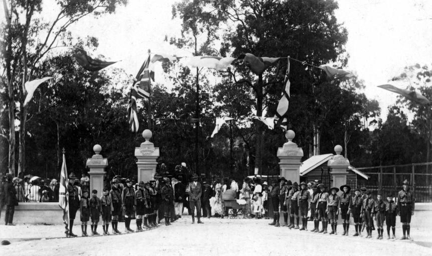 | Keywords: Kalinga Park Honour Gates - Day of Opening Ceremony.jpg en The guard formed by local scouts and cubs at the Official Opening Ceremony of the Kalinga Park Honour Gates 23 Oct 1920 1920-10-23 scanned from a photographic print no attribution to photographer or studio is apparent on the print other versions -27 407900 153 051876 Diggers Dr Clayfield QLD 4011 Custom license marker 2015 09 25 PD-1923 PD-Australia Photograph of an event on 23-Oct-1920 Printed published in limited circulation a short time later Exact date unknown Photographer unknown - photo was/is sealed in what is presumed to be its original frame Uploaded with UploadWizard Uncategorized 2015 September 25 1 |