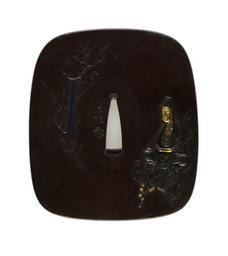 | Keywords: Kano Natsuo - Tsuba with the Bodhisattva Kannon - Walters 51218 - Back.jpg The bodhisattva Kannon sits on the right side of the tsuba While the bodhisattva is neither a man nor a woman depictions of this type have a distinctly feminine aspect She is called the White Robed Kannon because of her costume She sits near a waterfall Kannon is a compassionate deity who helps humans achieve Buddhahood The reverse of the tsuba depicts lotus flowers which are associated with Buddha and other Buddhist deities between 1848 1898 Edo-Meiji iron and brass with silver alloy and gold cm 8 5 accession number 51 218 39900 Henry Walters Baltimore date and mode of acquisition unknown Walters Art Museum Henry Walters Acquired by Henry Walters Signature Inscribed Natsuo kao ; Seal Inscribed Natsuo place of origin Edo present-day Tokyo Japan Walters Art Museum license Tsuba in the Walters Art Museum Kano Natsuo Media contributed by the Walters Art Museum needs category review |