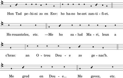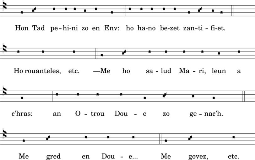 Keywords: Kantikou p2.svg br Skrid-sonerezh eil bajenn Kantikou brezonek eskopti Zan-Briek ha Landreger https //commons wikimedia org/w/index php title File Kantikou_brezonek_eskopti_Zan-Briek_ha_Landreger djvu page 7 Anonymous 1924 LilyPond source <pre> \version 2 18 2 \include gregorian ly \paper paper-width 13\cm line-width 12 5\cm paper-height 8 5\cm bottom-margin 1\mm top-margin 1\mm make-footer f \score << \new VaticanaVoice cantus \override Staff StaffSymbol 'color black \clef medicaea-do3 f \g\melisma \pes \auctum \ascendens a\melismaEnd \ a a a g a f \divisioMaxima a a a a a f \g\melisma \pes \auctum \ascendens a\melismaEnd \ g f \finalis s1 \break a a a \finalis f \g\melisma \pes \auctum \ascendens a\melismaEnd \ a a a a g a s1 \break f \divisioMaxima a a a a f \g\melisma \pes \auctum \ascendens a\melismaEnd \ g f \finalis \break s1 f \g\melisma \pes \auctum \ascendens a\melismaEnd \ a a a \finalis f \g\melisma \pes \auctum \ascendens a\melismaEnd \ a \new Lyrics \lyricsto cantus \set fontSize -1 0 Hon Tad pe -- hi -- ni zo en Env ho ha -- no be -- zet zan -- ti -- fi -- et Ho rouanteles etc ”Me ho sa -- lud Ma -- ri leun a c ™hras an O -- trou Dou -- e zo ge -- nac ™h Me gred en Dou -- e Me govez etc >> \layout line-width 125 Songs of Brittany SVG musical notation Images with LilyPond source code 1924 works in Bretagne PD-old