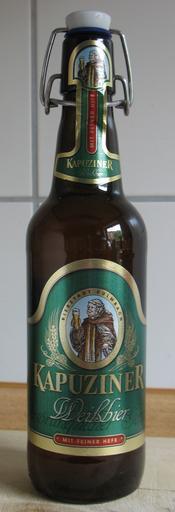 Keywords: Kapuziner Weissbier.JPG A bottle of Kapuziner Weißbier Wheat Beer own 2010-05 Miguel Andrade Beer bottles brown glass Kulmbacher beers Swing top bottles