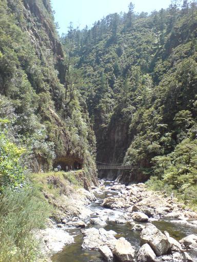 Keywords: Karangahake Gorge Battery Area Photos 04.jpg The track of a former horse-drawn rail line hammered out of a cliff face in a side canyon off the Karangahake Gorge in New Zealand Looking west to where a swing bridge connects the walking path nowadays used by tourists with the Windows Walk on the northern side of the canyon Coordinates are a bit approximate self-photographed 2011-01 Uploader -37 4290695 175 7249022 Photos taken by Ingolfson 2011 in New Zealand Waitawheta Gorge Suspension bridges in New Zealand Footbridges in New Zealand Mining railways in New Zealand Rivers of New Zealand Walking paths in New Zealand Former railway lines in New Zealand