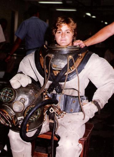 Keywords: Karen Kohanowich.jpg Karen Kohanowich former U S Navy Salvage Diver Acting Director of NOAA's National Undersea Research Program NURP and NEEMO 10 aquanaut wearing a Mark V diving rig during her service in the Navy http //www history navy mil/museums/keyport/womendivers/Photos/Kohanowich_MkV jpg U S Navy PD-USGov-Military-Navy Karen Kohanowich Standard diving dress Women looking at viewer |