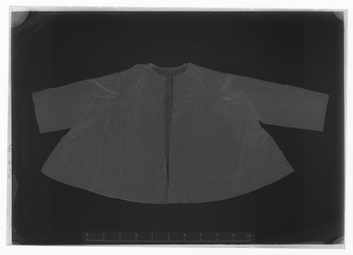 | Keywords: Kasack av scharlakansrött kläde, 1640-tal - Livrustkammaren - 70096-negative.tif I inventariet 1671 beskrivs denna dräkt på följande sätt Een Klädningh af fijnt rödt Scharlakan Nembl Een Casiach Een Tröija af rijk Silfr och gÿllenduk Ett par böxor af dito Scharlakan Tröjan finns medtagen i inventarierna från 1600-talet fram till 1821 varefter man kan läsa Tröjan brast vid Inventering 1833 Nu återstår alltså endast kasack och byxor från vilka plagg man tagit bort spetsarna I Klädkammarräkningen från 1675 uppges att till Hans Kungl Maj ts Karl XI s husgerådskammare har klädesförvaltaren Josias Fougstedt levererat följande silverspetsar nämligen från en röd sharlakansklädning som har suttit på kasacken och byxorna 21 ¼ alnar 1 kvarter breda guld- och silverspetsar till 2 st konfektdukar utkvitterade av Anders Andersson Stockholm den 28 augusti 1675 <br/><br/>Skuren i 2 framstycken och 1 bakstycke - ty det senare saknar mittsöm Framkanterna är raka Plagget liknar för övrigt kasacken till dräkt gnr 3386 och nr 3391 Ärmarna är långa och sydda av 2 större stycken samt skarvade med 2 långa triangulära kilar insydda utefter ärmarnas raka öppna översida samt som fortsättning härpå ända upp till axelsömmen ett par mycket smala knappt centimeterbreda remsor Överst är ett par oregelbundna kilar fogadetill den rundade överkanten Kasacken är mitt fram 80 cm lång mitt bak 85 5 cm där man gjort ett ca 30 cm långt sprund Sidsömmarna har 33 cm långa sprund placerade 24 cm nedanför ärmhålet <br/><br/>Kasacken har haft en knapprad med 30 st knappar längs hela vänster framstycke i de öppna sidosprunden och i baksprundet har också knappar suttit Kasackens kläde har avskurits nertill utan att vikas till någon fåll Men vid halsen har man gjort en smal skoning som är ca 1 cm hög på rätan och 1 5 cm på baksidan Den saknas är bortklippt på vänster framstycke Den har kastats fast med mycket långa glesa stygn ca 2 stygn/cm och från insidan har man sedan tråcklat ner slån och kastat fast den utanpå brokadfodret Där man måst skarva tyget har man gjort detta mycket fint med små täta kaststygn från avigan <br/><br/>Kasackens högra ärm är avklippt så att den nu är blott 44 cm lång från ärmhålets nedre kant 58 cm lång längs framsömmen Ärmarna har varit öppna med 28 cm långa sprund längs framsömmarna med kilarna och på den yttre ärmsidan har funnits 11 knappar vilkas hål syns på samma sätt som i de övriga sprunden <br/><br/>Fodret som ännu delvis finns kvar är av guldbrokad dess vådbredd är ca 53 cm utan stad 72x20 tr/cm2 Det är en ripsvävnad med varp av otvinnat vitt silke Mönstret har tätt strödda blommor i guld d v s otvinnat gult silke som högertvinnats med guldlan och avtecknar sig mot en botten som vävts av vitt otvinnat silke med silverlan i bottenslaget på rätan Stad ca 0 9 cm 12 gröna 4 vita 12 gröna 1 gul trådtuskaft Mönsterrapport h 10 5 cm b 6 6 cm I staden går inte de metallomspunna trådarna ut de vänder runt kring en gul tråd <br/><br/>Analysresultat <br/>Förgylld silvertråd tvinnad med textiltråd huvudbeståndsdelar <br/>Silver xxx<br/>Guld xx<br/>Koppar x<br/>Zink 0<br/><br/>Av det eleganta fodret har lämnats kvar stycken i hela höger bakstycke större delen av vänster bakstycke samt icke fullt en vådbredd i höger framstycke Mitt bak har man sytt ihop stadkant mot stadkant så att man tydligen först lagt den ena våden mot klädet och sedan vikt in staden på det andra stycket den högra våden och sytt samman dessa med ljusrött silke Kanten är uppfållad med glesa kaststygn med blekrosa 2-trådigt högertvinnat silke I höger framstycke sitter fodret i motsatt riktning mot i ryggen original caption decade 1640 broadcloth Färg scharlakansröd d1 - dräkt - yttermaterial material kläde size mm 800 mitt fram size mm 855 mitt bak size mm 580 ärm LRK Karl X Gustav av Sverige Ryssland och Sverige under 1600-talet Modelejon 2002 place of origin original filename LN_B13228_016108 55887 inventory number LRK 19544 70096 CC0 Kasack av scharlakansrött kläde 1640-tal - Livrustkammaren - 70096 tif |