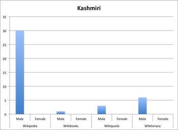 | Keywords: Kashmiri Gender Wikiproject.png en Data is from https //toolserver org/~robin/ tool incubatorprefs toolserver and was gather on 29 December 2011 It shows differences in accounts on wiki projects in the language referenced in the file name where users explicitly state their gender This is not all users on a project 2011-12-29 own LauraHale cc-zero Wikimedia statistics Uploaded with UploadWizard Bar charts Diagrams in English Gender | ||||