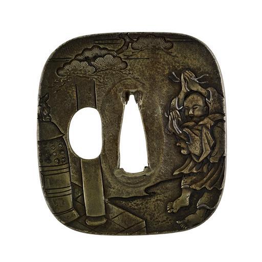 Keywords: Kawamura Tsuneshige - Tsuba with the Bell of D么j么ji - Walters 51341.jpg The scene depicted is from a story about the bell at the temple D鬸鬸i On right are two monks with prayer beads in the act of praying At the left the large bell of the temple is shown fallen from its tower A jealous woman transformed into a dragon while chasing a monk she thought had promised to marry her The monks of D鬸鬸i hid the monk in the bell tower The bell fell trapping him under it The woman in her dragon form coiled her body around the bell and breathed flames on it This killed the monk trapped inside The story is retold in noh and kabuki plays of the same name In the plays a dancer comes to the temple to celebrate the installation of a new bell She dances under the bell and when it falls on her is transformed into the dragon A pine tree and stream are shown on the reverse late Other date century 18 Edo sentoku cm 7 13 6 64 0 5 accession number 51 341 4125 Henry Walters Baltimore date and mode of acquisition unknown Walters Art Museum Henry Walters Acquired by Henry Walters Signature Tsuneshige place of origin Edo present-day Tokyo Japan Walters Art Museum license Tsuba in the Walters Art Museum Kawamura Tsuneshige Media contributed by the Walters Art Museum needs category review Reliefs of dancers on Japanese sword fittings |