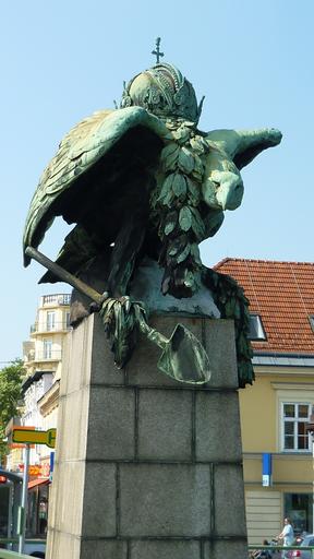 Keywords: Kennedybrücke Wien Adler.JPG en Historical stone pillar bearing a metal eagle carrying the Imperial crown from former Hietzing Bridge transferred to actual Kennedy Bridge in Vienna linking 13th and 14h districts over the Wien river de Steinerner Pfeiler der einen metallenen Adler mit der Kaiserkrone am Rücken trägt von der früheren Hietzinger Brücke auf die derzeitige Kennedybrücke in Wien übertragen die den 13 und den 14 Bezirk über den Wienfluss verbindet doo 77647 own Wolfgang J Kraus 2010-07-21 Kennedybrücke Adler |