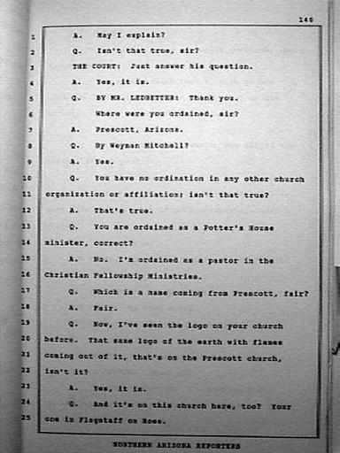 | Keywords: Kenneth Haywood Perjury P140.JPG en Ledbetter continues his questioning of Kenneth Haywood further exposing his perjury Notice that he purposely uses the word affiliation which is word that Haywood used when he said no affilliation in previous testimony with regards to his relationship to the Wayman Mitchell's church Official Court Document Flagstaff AZ Coconinio County Superior Court CV95-00118 Northern Arizona Reporters 418 East Birch Avenue P O Box 22142 Flagstaff AZ 86001 1995-06-06 Kenneth Haywood |