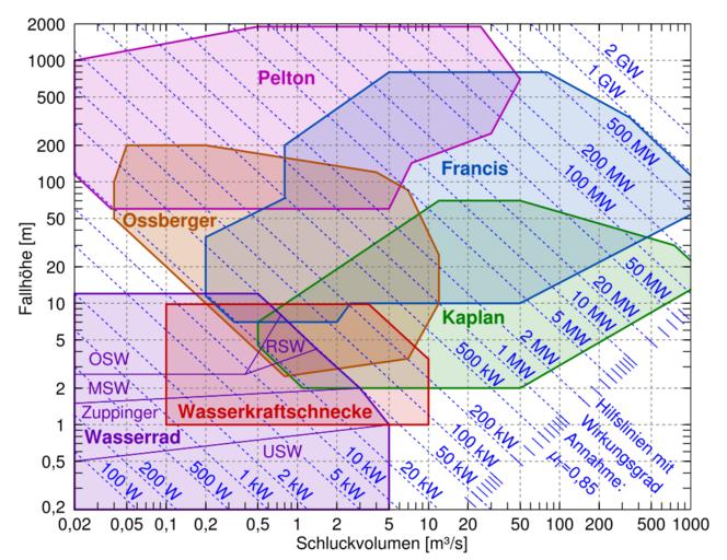 | Keywords: Kennfeld Wasserturbinen.svg Pelton-Turbine Francis-Turbine Ossberger-Turbine auch Durchströmturbine oder Querstromturbine Wasserkraftschnecke Wasserrad mit der Unterteilung OSW Oberschlächtiges Wasserrad RSW Rückschlächtiges Wasserrad Zuppinger Zuppinger-Rad + Kropfrad + Poncelet-Rad USW Unterschlächtiges Wasserrad own <br /> Data Sources <br /> Sourcing data is difficult Most charts even those in general literature ultimately come from turbine suppliers and producers The suppliers tend to mark the areas of their products So it is never a representation of all turbines just a representation of turbines on offer To overcome this severals charts are combined Pelton Kaplan and Francis Dubble Taschenbuch für den Maschinenbau Ausgabe 20 - The data comes ultimately from Voith which produces large scale turbines https //www andritz com/index/hydro/hy-small-hydropower-standard htm smaller scale turbines w en Bieudron_Hydroelectric_Power_Station 2010 pelton record Ossberger / Durchströmturbine / Cross-flow http //www ossberger de/cms/hydro/ossberger-durchstroemturbine/ Wasserkraftschnecke / Archimedes Screw http //www rehart-power de/wasserkraftschnecken/effizienz html says minimum 1 m and 500 l/s http //www spaansbabcock com/de/wasserkraft/vorteile aspx says 100 l/s “ 15 m³/s http //www oecosys com/1/Members/jocham/weltgroste-wasserkraftschnecke-in-kindberg-die-archimedische-schraube-erfahrt-eine-neue-anwendung says 1 “10 m 0 1 “5 5 m³/s max 300 kW https //www andritz com/de/no-index/pf-detail productid 8775 says up to 10 m up to 10 m³/s up to 500 kW to my knowledge the biggest examples ever build are at 250 kW Wasserrad / Waterwheel Mühlenbau Wasserräder und Windmühlen - bewahren und erhalten Werner Schnelle Page 116 or http //www wasserrad-drews de/dokumente/Kleinwasserkraft pdf Page 4 Jahobr 2016-11-20 Cc-zero Inkscape v source code for plotting a water turbine chart The code generates only a basic image to get the logarithmic scale right The final work has to be done in inkscape by Jahobr 2016-11-20 Definitions fontToUse 'Helvetica'; set 0 'defaultAxesFontName' fontToUse set 0 'defaultTextFontName' fontToUse flowRange 0 02 1000; x XTickValues 0 02 0 05 0 1 0 2 0 5 1 2 5 10 20 50 100 200 500 1000; heightRange 0 2 2000; y YTickValues 0 2 0 5 1 2 5 10 20 50 100 200 500 1000 2000; Data Pelton Turbine dat struct; dat Pelton name 'Pelton'; flow height PelDubble 0 5 110 Source Voith / Dubbel 30 250 50 700 30 1000 5 1900 0 5 1900; PelBieudron 5 1900 connect in with Dubble Area 5 700 connect in with Dubble Area 50 700 connect in with Dubble Area 25 1900; 2010 Record w en Bieudron_Hydroelectric_Power_Station PelAndritz 0 038 60 Source Andritz 5 60 12 300 3 5 1000 0 02 1000 0 02 115; MergeX MergeY polybool 'union' PelDubble 1 PelDubble 2 PelBieudron 1 PelBieudron 2 ; MergeX MergeY polybool 'union' MergeX MergeY PelAndritz 1 PelAndritz 2 ; dat Pelton patch MergeX MergeY; dat Pelton color 0 7 0 0 7; dat Pelton style 'full'; Kaplan Turbine dat Kaplan name 'Kaplan'; flow height KapDubbel 1 5 2 Source Voith / Dubbel 50 2 1400 16 750 30 50 70 top 12 70 top 1 12 1 3; KapAndritz 1 1 2 Source Andritz 40 2 40 4 10 8 30 4 30 0 5 7 0 5 4 5; MergeX MergeY polybool 'union' KapDubbel 1 KapDubbel 2 KapAndritz 1 KapAndritz 2 ; dat Kaplan patch MergeX MergeY; dat Kaplan color 0 0 5 0; dat Kaplan style 'full'; Francis Turbine dat Francis name 'Francis'; flow height FraDubbel 0 8 10 Source Voith / Dubbel 50 10 1600 70 340 340 80 800 5 800 0 8 200; FraAndritz 0 33 7 Source Andritz 2 7 8 40 7 150 2 150 0 2 35 0 2 11 5; MergeX MergeY polybool 'union' FraDubbel 1 FraDubbel 2 FraAndritz 1 FraAndritz 2 ; dat Francis patch MergeX MergeY; dat Francis color 0 0 3 0 7; dat Francis style 'full'; Cross-flow or Ossberger dat Ossberger name 'Ossberger'; flow height dat Ossberger patch 0 8 2 5 source http //www ossberger de/cms/fileadmin/user_upload/1-1-02 pdf 7 3 5 12 10 right 12 25 right 7 85 4 120 0 2 200 top 0 05 200 top 0 04 100 left 0 04 50; left dat Ossberger color 0 7 0 3 0; dat Ossberger style 'full'; OSW dat Wasserrad name 'Wasserrad'; flow height dat Wasserrad patch flowRange 1 heightRange 1 left bottom 5 heightRange 1 right bottom 5 1 right 3 2 corner zuppinger 1 4 4 2 RSW/MWS 0 75 8 OSW/RWS 0 5 12 top flowRange 1 12; top dat Wasserrad color 0 4 0 0 7; dat Wasserrad style 'full'; 'subsection' dat OSW name 'OSW'; flow height dat OSW patch flowRange 1 2 6 left bottom 0 4 2 6 0 75 8 0 5 12 flowRange 1 12; dat OSW color 0 4 0 0 7; dat OSW style 'subsection'; 'full' RSW dat RSW name 'RSW'; rückenschlächtig flow height dat RSW patch 0 4 2 6 left 1 4 4 2 right 0 75 8; top dat RSW color 0 4 0 0 7; dat RSW style 'subsection'; 'full' MSW dat MSW name 'MSW'; mittelschlächtig flow height dat MSW patch flowRange 1 1 5 3 2 1 4 4 2 0 4 2 6 flowRange 1 2 6; dat MSW color 0 4 0 0 7; dat MSW style 'subsection'; 'full' Zulppinger dat Zulppinger name 'Zuppinger'; Zuppinger + Kropfrad + Poncelet-Rad flow height dat Zulppinger patch flowRange 1 0 5 5 1 3 2 flowRange 1 1 5; dat Zulppinger color 0 4 0 0 7; dat Zulppinger style 'subsection'; 'full' USW dat USW name 'USW'; unterschlächtig flow height dat USW patch flowRange 1 heightRange 1 5 heightRange 1 5 1 flowRange 1 0 5; dat USW color 0 4 0 0 7; dat USW style 'subsection'; 'full' Archimedes Screw dat Screw name 'Wasserkraftschnecke'; flow height dat Screw patch 0 1 1 10 1 10 3 5 3 5 9 9 0 1 9 9; dat Screw color 0 8 0 0; dat Screw style 'full'; 'subsection' figure figH figure 55824 ; clf; axeH axes; hold on box on set axeH 'XScale' 'log' 'yScale' 'log' xlim flowRange ylim heightRange grid off matlab grid does not work nicely set axeH 'XTick' XTickValues ; strrep cellstr num2str YTickValues ' ' ' ' set axeH 'YTick' YTickValues ; strrep cellstr num2str YTickValues ' ' ' ' set axeH 'YMinorTick' 'off' ; matlab ticks do not work nicely set axeH 'XMinorTick' 'off' ; matlab ticks do not work nicely set axeH 'XMinorGrid' 'off' ; matlab ticks do not work nicely set axeH 
