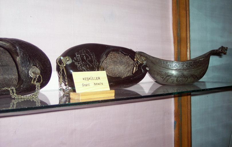 | Keywords: Keskul GrantBowl.JPG Keşküls from the dergâh of Hacı Bektaş-ı Veli w Hajji Bektash Wali who is a well known Turkish Sufi The dergâh is used as a museum today Keşküls are grant bowls; Sufis of the dergâh begged from people and used these bowls during begging Sufis believed that begging would test the dervish's character and help him to overcome his vanity and pride Keşkül as a word means bowl in Farsi Own 2005-01-01 01 19 43 Noumenon Sufism Begging bowls | ||||