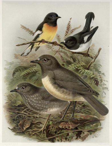 Keywords: Shows tomtits in foreground and robins on a branch above, in a bush setting Quantity: 1 colour art print(s) in book.. Physical Description: Lithograph, coloured 273 x 204 mm. Keulemans, John Gerrard, 1842-1912. Keulemans, John Gerrard, 1842-1912 :South Island tomtit, myiomoira macrocephala. North Island tomtit, myiomoira toitoi. North Island robin, miro australia. South Island robin, miro albifrons. / J. G. Keulemans delt. & lith. Judd & Co. [Plate V. 1888].. Buller, Walter Lawry (Sir) 1838-1906 :A history of the birds of New Zealand. 2d ed. London, John van Voorst, 1888.. Ref: PUBL-0012-05. Alexander Turnbull Library, Wellington, New Zealand. natlib.govt.nz/records/22884548 Shows tomtits in foreground and robins on a branch above, in a bush setting Quantity: 1 colour art print(s) in book.. Physical Description: Lithograph, coloured 273 x 204 mm. Keulemans, John Gerrard, 1842-1912. Keulemans, John Gerrard, 1842-1912 :South Island tomtit, myiomoira macrocephala. North Island tomtit, myiomoira toitoi. North Island robin, miro australia. South Island robin, miro albifrons. / J. G. Keulemans delt. & lith. Judd & Co. [Plate V. 1888].. Buller, Walter Lawry (Sir) 1838-1906 :A history of the birds of New Zealand. 2d ed. London, John van Voorst, 1888.. Ref: PUBL-0012-05. Alexander Turnbull Library, Wellington, New Zealand. natlib.govt.nz/records/22884548 |