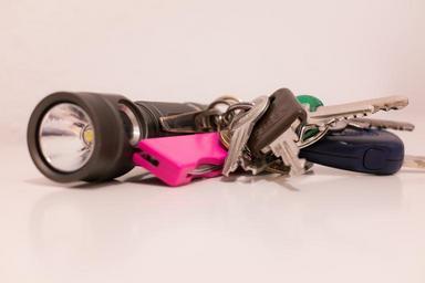 Keywords: key flashlight pocket knife keychain door key house keys car keys metal shiny iron shut off close up