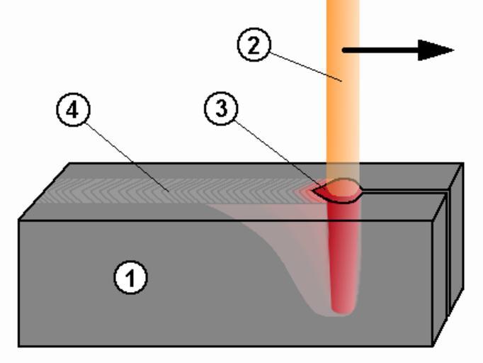 | Keywords: Keyhole welding scheme.png en Schematic illustration of Keyhole welding such as electron beam welding laser welding and plasma welding 1 object 2 energy ray 3 keyhole 4 weld nl Schematische illustratie van keyhole lassen zoals bij elektronenstraallassen laserlassen en plasmalassen 1 werkstuk 2 energiebundel 3 keyhole 4 las own Erik Wannee 2011-07-25 Cc-zero Welding diagrams |