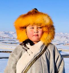 Keywords: kid winter child boy snow childhood season holiday people fun cold white cute young mongolia hat traditional dress fur portrait
