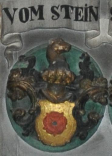 Keywords: Kiedrich Katharinenaltar Wappen R07.jpg Kiedrich Pfarrkirche St Valentin Katharinenaltar Ahnenwappen aus der Ahnenprobe der Juliane von Schwalbach geb von Eltz 1620 ; hier Wappen vom Stein zu Nassau own own photograph 2015-05-01 Photo Andreas Praefcke Photos by User AndreasPraefcke Katharinenaltar Pfarrkirche Kiedrich Coats of arms of Stein zu Nassau family |