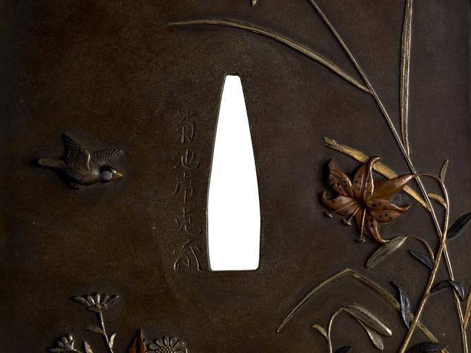 Keywords: Kikuchi Tsunekatsu - Tsuba with a Sparrow and Autumn Foliage - Walters 51258 - Mark A.jpg A small sparrow is depicted in flight at the left side of this tsuba A stalk of pampas grass dominates the right side and small chrysanthemums are along the both Although normally a late summer flower lilies are shown at the right and on the reverse early-mid 18th century mid Edo shibuichi gold silver copper shakudo at bottom cm 8 15 6 68 0 4 ; width at top cm 6 89 ; width at center cm 6 69 accession number 51 258 17243 Henry Walters Baltimore date and mode of acquisition unknown Walters Art Museum Henry Walters Acquired by Henry Walters Signature Kikuchi/Tsunekatsu kao place of origin Edo present-day Tokyo Japan Walters Art Museum license Tsuba in the Walters Art Museum Kikuchi Tsunekatsu Media contributed by the Walters Art Museum needs category review