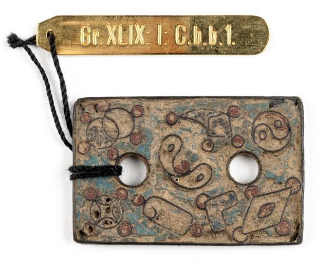 | Keywords: Kinesiskt bältbeslag i brons med yin yang - Hallwylska museet - 100118.tif LSH artwork sv Beslag till bälte I tvärriktningen svagt böjd rektangulär skiva vari två symmetriskt ställda runda hål På framsidan i guldsmedsemalj dekor av de åtta taoistiska dyrbarheterna av vilka bara fem är tydliga De små ringarna omkring föremålen i rött den övriga emaljen i blått Baksidan slät Längd 4 cm ; bredd 2 6 cm tjocklek 0 3 cm original caption Kinesiskt bältbeslag i brons med yin yang <br/> Nyckelord Kina Symboler Bälte Föremålsbild Brons Beslag HWY place of origin CN original filename hm_dig15069 15015 inventory number HWY XLIX I C b b 01 100118 CC-BY-SA Miguel Herranz Fittings China Bronze Signs Bronze objects Belts Miguel Herranz Media contributed by LSH unmatched keyword Media contributed by LSH 2015-11 |