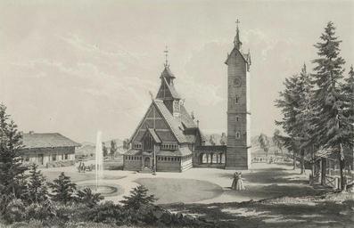 Keywords: Kirche Wang Koska.jpg de Zeichnung der Kirche Wang in Niederschlesien von Ferdinand Koska Litografie durch die Lithographische Anstalt von Mercier Loeillot in Berlin Digital Library of the Silesian Voivodeship www sbc org pl Creator Ferdinand Koska 19th century / 19 Jahrhundert Ferdinand Koska Vang Stave Church PD-old-100 |