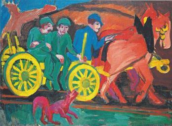 Keywords: Kirchner - Pferdegespann mit drei Bauern.jpg Pferdegespann mit drei Bauern oil on canvas cm 92 123 Werner Gabrielle Merzbacher repro from artbook 1920/21 Creator Ernst Ludwig Kirchner Other versions PD-old-auto-1923 1938 Paintings by Ernst Ludwig Kirchner Peasants in early 20th century Paintings of peasants 1920s paintings Kirchner Gabrielle and Werner Merzbacher Horse-drawn carts in art